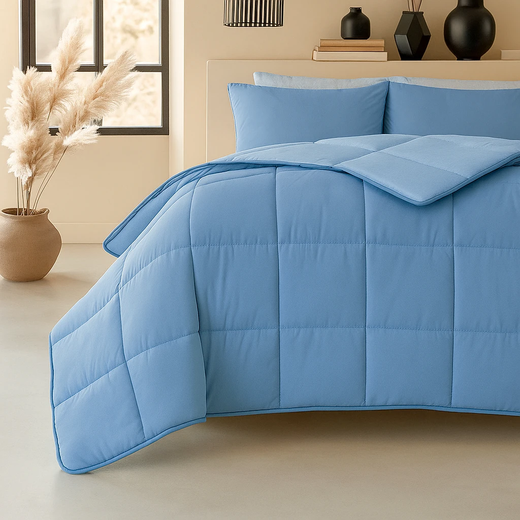 NieuwGeniet van slaapcomfort en onderhoudsgemak met het stijlvolle lichtblauw / azuur dubbelzijdige dekbed. Hippe kleuren op je bed in 3 seconde! Snel, gemakkelijk en Comfortabel.