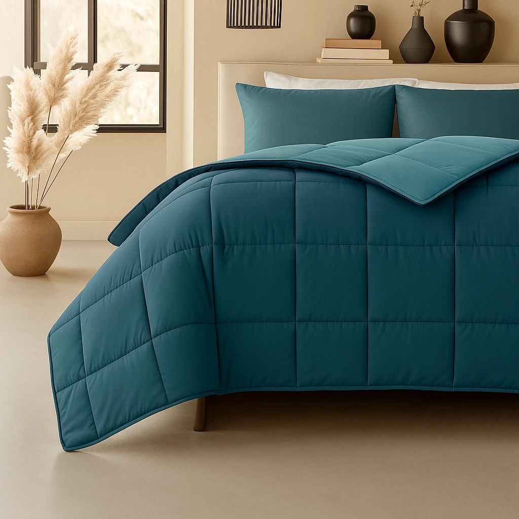 Het kant-en-klare dekbed straalt frisheid en comfort uit met zijn petrolblauw – mastie dubbelzijdige vaste hoes. De duurzame polyester hoes voelt zacht aan, is slijtvast en behoudt zijn kleur en vorm, zelfs na veelvuldig gebruik.
